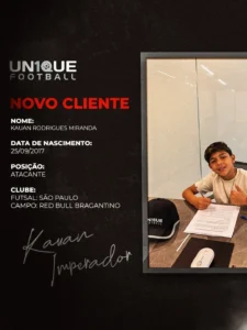 Kauan Imperador, atacante do Red Bull Bragantino (campo) e do São Paulo (futsal), é o novo cliente da Un1que Football. O jovem faz parte da geração 2017.